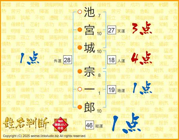 池(7画)宮(10画)城(10画) 宗(8画)一(1画)郎(10画)