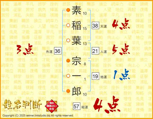 素(10画)稲(15画)葉(13画) 宗(8画)一(1画)郎(10画)