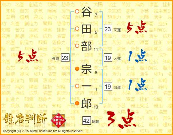谷(7画)田(5画)部(11画) 宗(8画)一(1画)郎(10画)