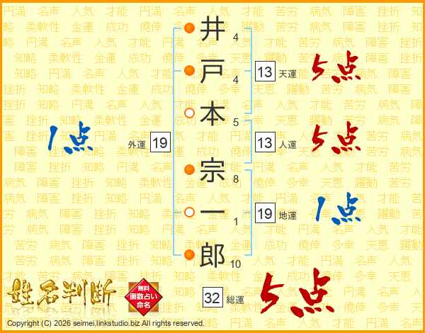 井戸本宗一郎さんの総運は32画の5点!
