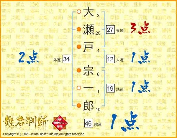 大(3画)瀬(20画)戸(4画) 宗(8画)一(1画)郎(10画)