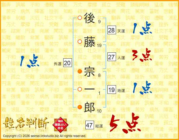 後(9画)藤(19画) 宗(8画)一(1画)郎(10画)