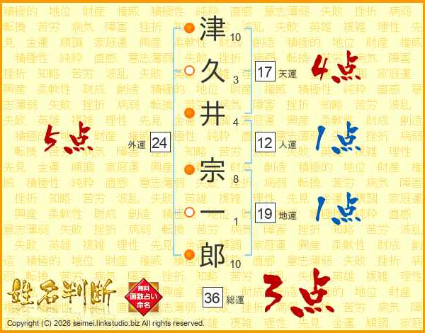 津(10画)久(3画)井(4画) 宗(8画)一(1画)郎(10画)