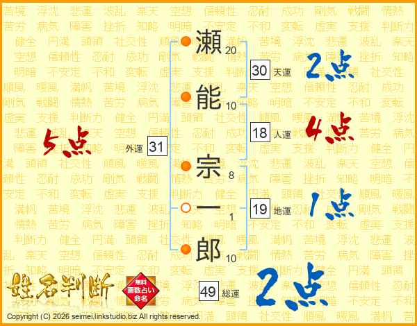 瀬(20画)能(10画) 宗(8画)一(1画)郎(10画)
