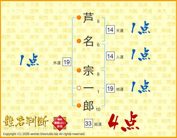 芦(8画)名(6画) 宗(8画)一(1画)郎(10画)