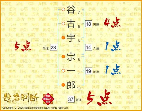 谷(7画)古(5画)宇(6画) 宗(8画)一(1画)郎(10画)
