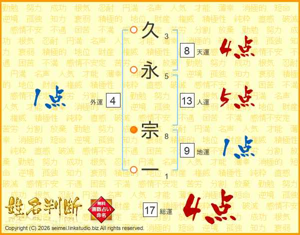 生活面を象徴する運勢です。外部から受ける影響力を表し、結婚運、家庭運や職場、環境への順応性を表します。総運から人運を引いた画数。姓や名が1文字の場合を除く。