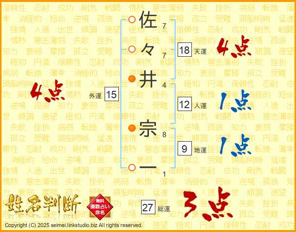 佐(7画)々(7画)井(4画) 宗(8画)一(1画)