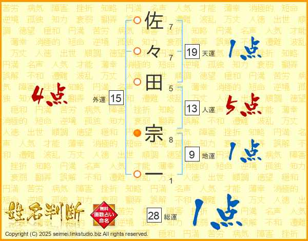 佐(7画)々(7画)田(5画) 宗(8画)一(1画)