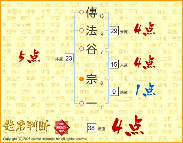 生活面を象徴する運勢です。外部から受ける影響力を表し、結婚運、家庭運や職場、環境への順応性を表します。総運から人運を引いた画数。姓や名が1文字の場合を除く。