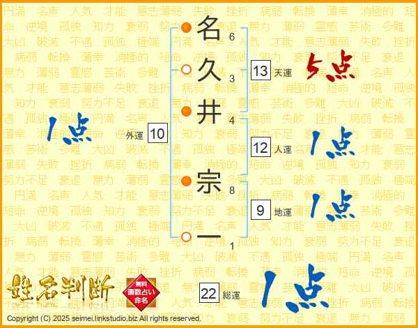 名(6画)久(3画)井(4画) 宗(8画)一(1画)