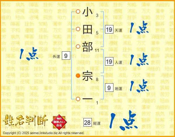 小(3画)田(5画)部(11画) 宗(8画)一(1画)