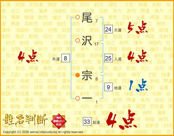 尾沢宗一さんの総運は33画の4点!
