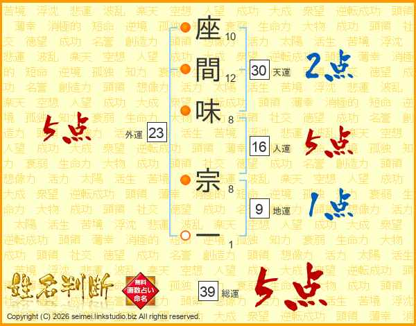 座(10画)間(12画)味(8画) 宗(8画)一(1画)