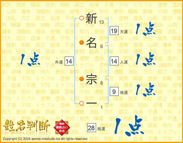 生活面を象徴する運勢です。外部から受ける影響力を表し、結婚運、家庭運や職場、環境への順応性を表します。総運から人運を引いた画数。姓や名が1文字の場合を除く。