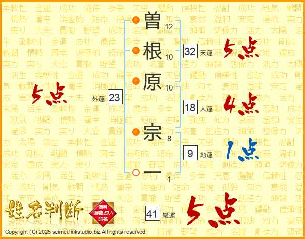 曽(12画)根(10画)原(10画) 宗(8画)一(1画)