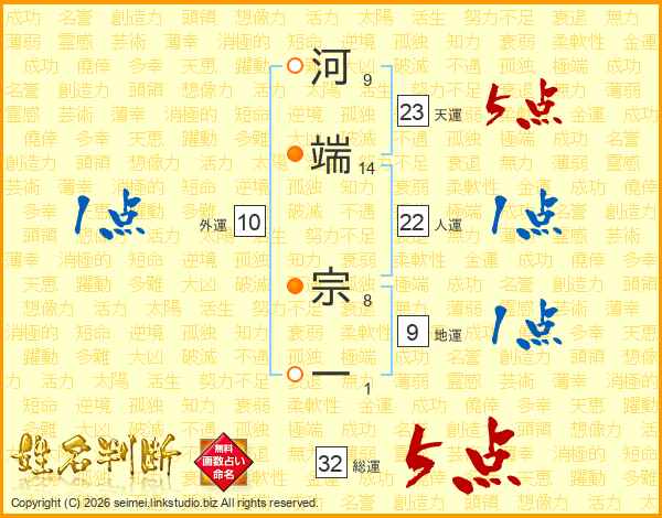 生活面を象徴する運勢です。外部から受ける影響力を表し、結婚運、家庭運や職場、環境への順応性を表します。総運から人運を引いた画数。姓や名が1文字の場合を除く。