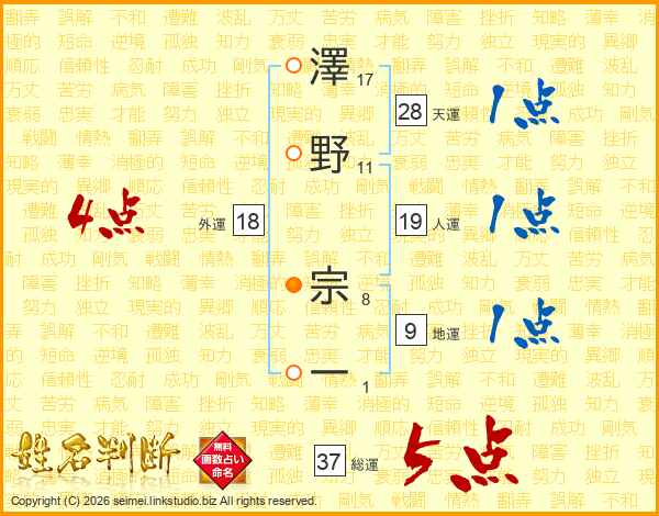 あなたの人生を表す1番重要な運勢です。生涯を通じて影響する総合運となり、主に50歳以降の晩年期に影響を及ぼします。苗字と名前の合計画数。