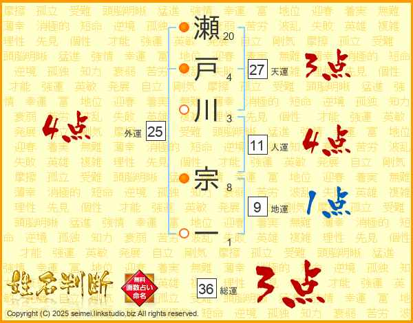 瀬(20画)戸(4画)川(3画) 宗(8画)一(1画)