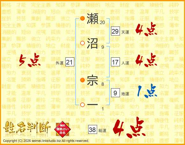 瀬沼宗一さんの総運は38画の4点!