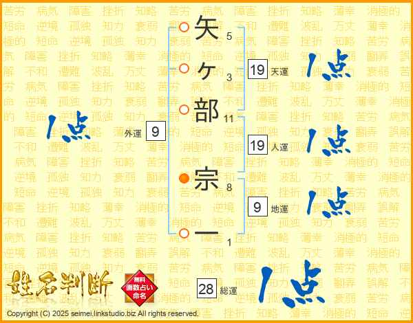 矢(5画)ヶ(3画)部(11画) 宗(8画)一(1画)