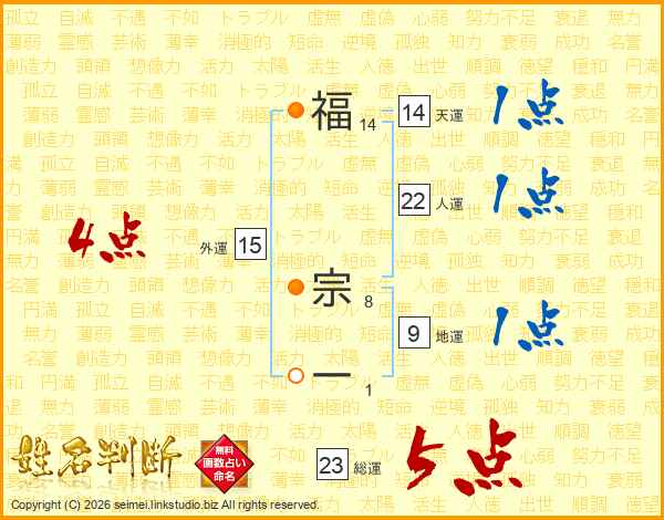 生活面を象徴する運勢です。外部から受ける影響力を表し、結婚運、家庭運や職場、環境への順応性を表します。総運から人運を引いた画数。姓や名が1文字の場合を除く。