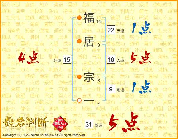 生活面を象徴する運勢です。外部から受ける影響力を表し、結婚運、家庭運や職場、環境への順応性を表します。総運から人運を引いた画数。姓や名が1文字の場合を除く。