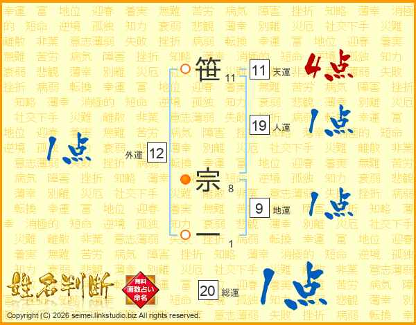 生活面を象徴する運勢です。外部から受ける影響力を表し、結婚運、家庭運や職場、環境への順応性を表します。総運から人運を引いた画数。姓や名が1文字の場合を除く。