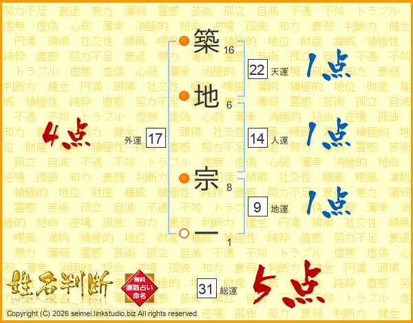 生活面を象徴する運勢です。外部から受ける影響力を表し、結婚運、家庭運や職場、環境への順応性を表します。総運から人運を引いた画数。姓や名が1文字の場合を除く。