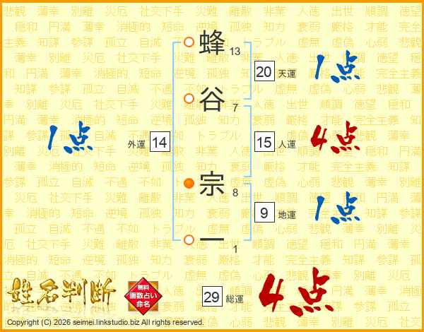 蜂(13画)谷(7画) 宗(8画)一(1画)