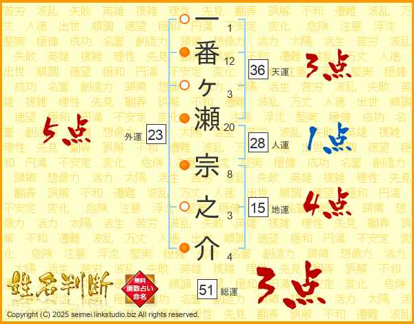 一番ヶ瀬宗之介さんの総運は51画の3点!