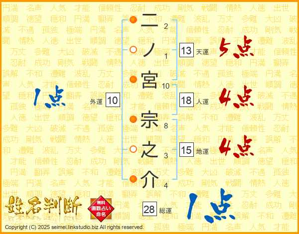 二(2画)ノ(1画)宮(10画) 宗(8画)之(3画)介(4画)