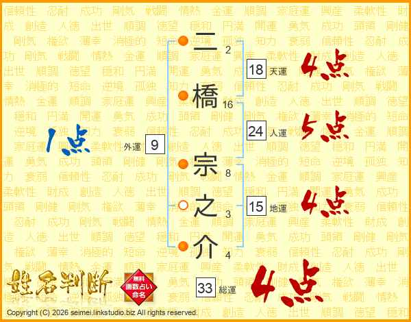 二(2画)橋(16画) 宗(8画)之(3画)介(4画)