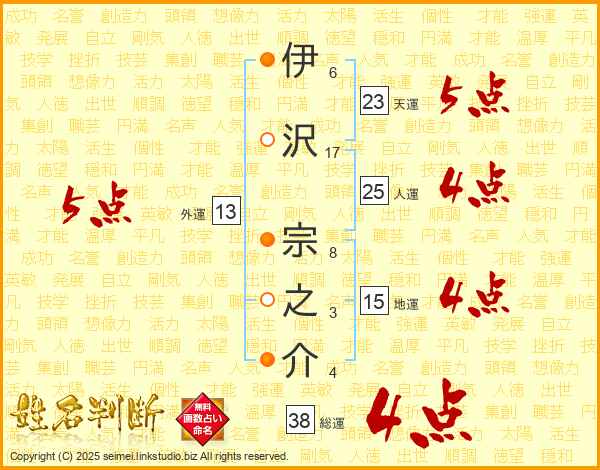 伊(6画)沢(17画) 宗(8画)之(3画)介(4画)