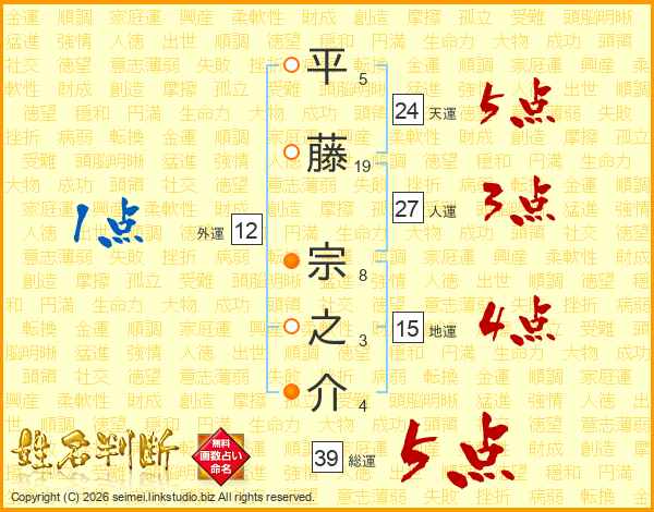 平(5画)藤(19画) 宗(8画)之(3画)介(4画)