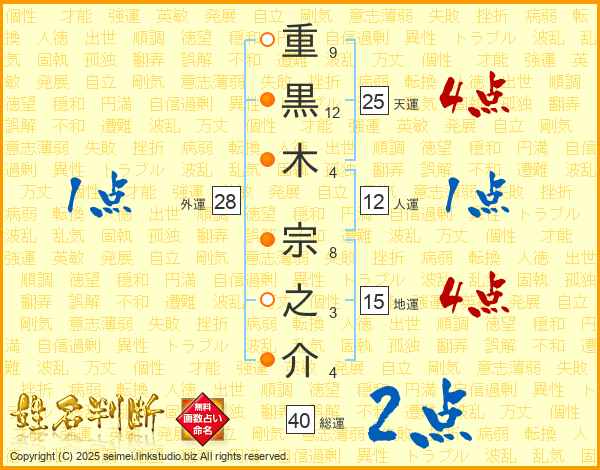 重(9画)黒(12画)木(4画) 宗(8画)之(3画)介(4画)