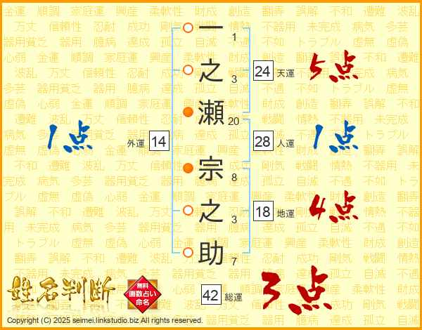 一之瀬宗之助さんの総運は42画の3点!
