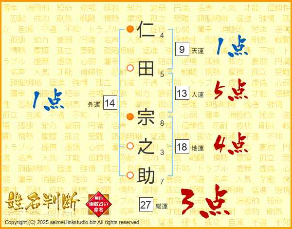 仁(4画)田(5画) 宗(8画)之(3画)助(7画)