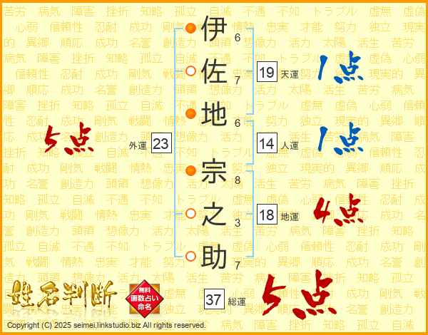 伊(6画)佐(7画)地(6画) 宗(8画)之(3画)助(7画)