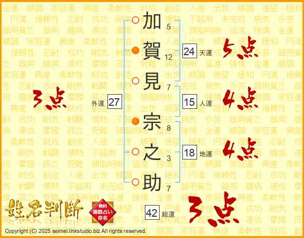 加(5画)賀(12画)見(7画) 宗(8画)之(3画)助(7画)