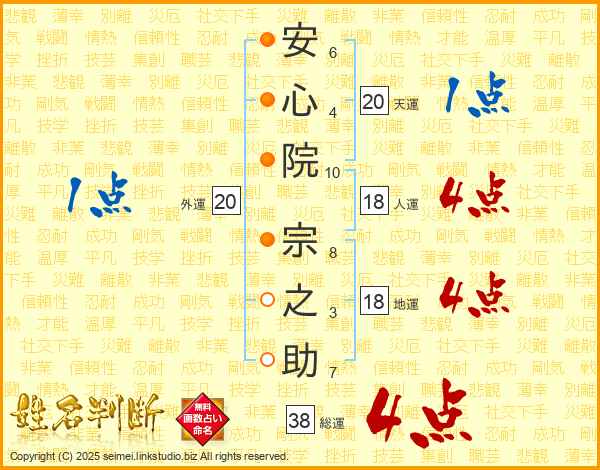 安(6画)心(4画)院(10画) 宗(8画)之(3画)助(7画)