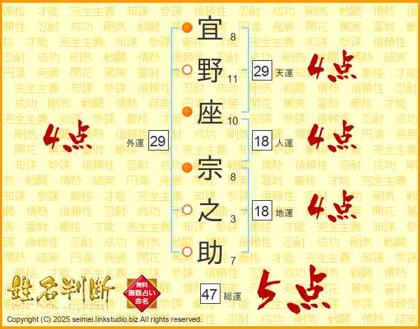 宜(8画)野(11画)座(10画) 宗(8画)之(3画)助(7画)