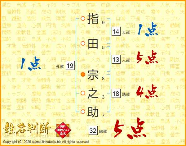指(9画)田(5画) 宗(8画)之(3画)助(7画)