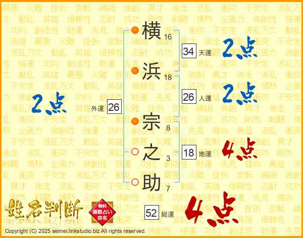 横(16画)浜(18画) 宗(8画)之(3画)助(7画)