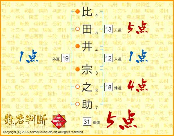 比(4画)田(5画)井(4画) 宗(8画)之(3画)助(7画)