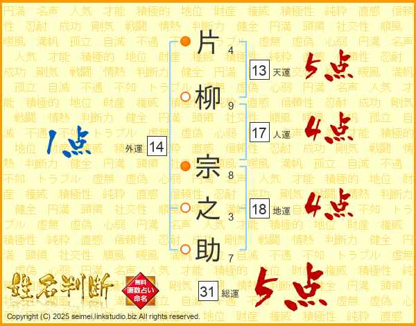 片(4画)柳(9画) 宗(8画)之(3画)助(7画)