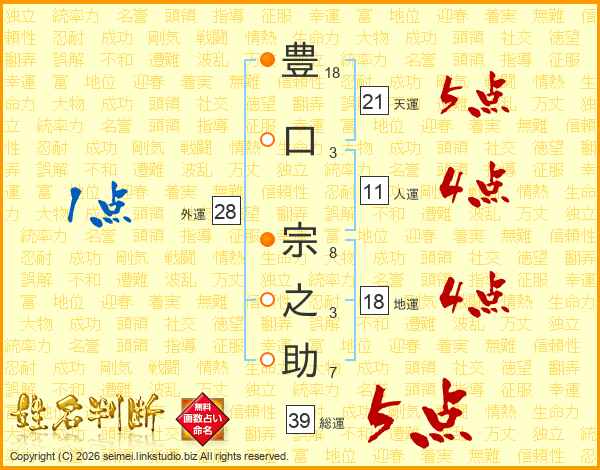 豊(18画)口(3画) 宗(8画)之(3画)助(7画)