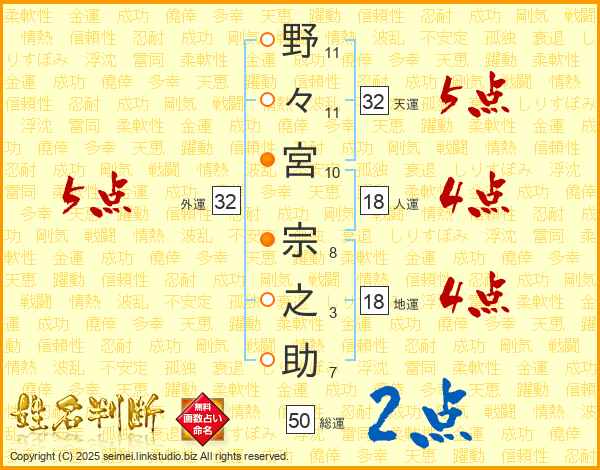 野(11画)々(11画)宮(10画) 宗(8画)之(3画)助(7画)