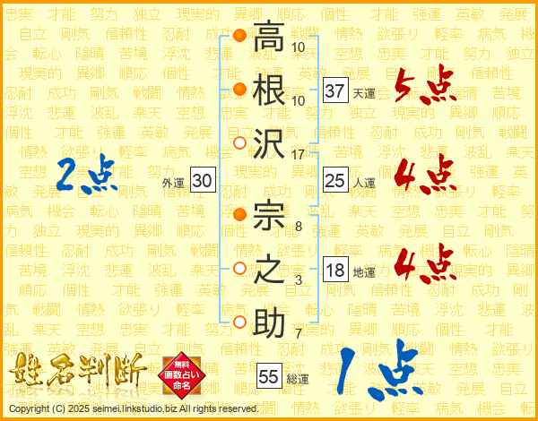 高(10画)根(10画)沢(17画) 宗(8画)之(3画)助(7画)