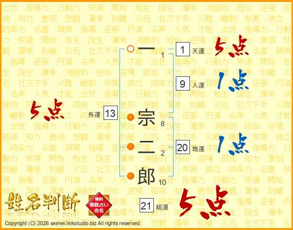 あなたの人生を表す1番重要な運勢です。生涯を通じて影響する総合運となり、主に50歳以降の晩年期に影響を及ぼします。苗字と名前の合計画数。